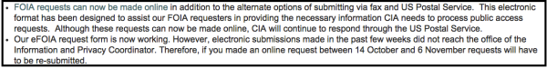 If you made any FOIA requests to the CIA using their electronic submission portal between October 14 and November 6, you’re going to need to resend them. Buried in the CIA’s Electronic Reading Room is a notice that it lost over three weeks of requests: “Our eFOIA request form is now working. However, electronic submissions made in the past few weeks did not reach the office of the Information and Privacy Coordinator. Therefore, if you made an online request between 14 October and 6 November requests will have to be re-submitted.”